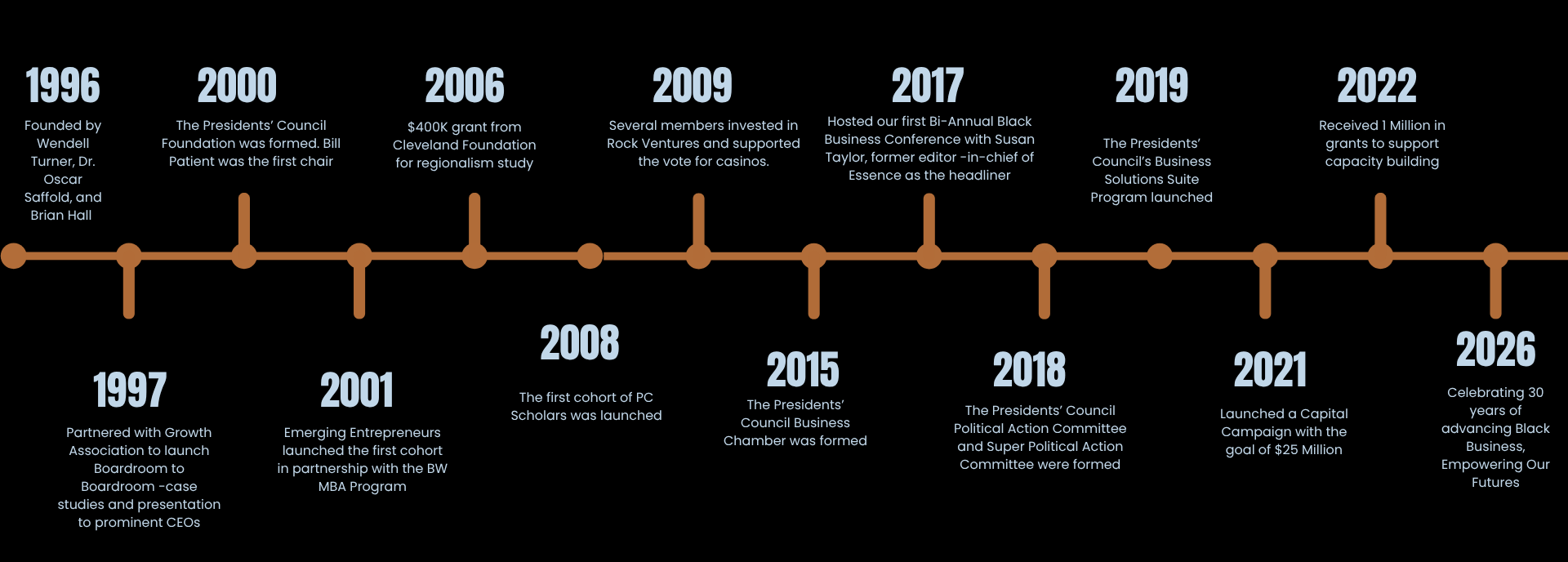 Founded in 1996, The Presidents’ Council began as a network of successful African American business leaders. Over the years, we’ve grown into a multi-entity ecosystem committed to community empowerment and wealth creation.